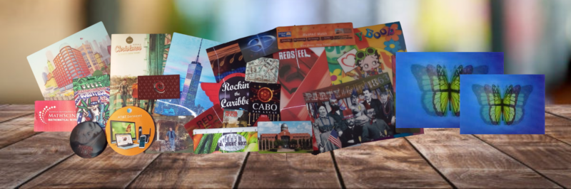 Postcards, buttons, magnets, wood encased cards, metal back, stickers, tags, point of sale