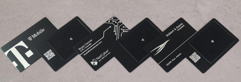 These smart metal business cards are pre-designed. Simply have us personalize the front for you and program the NFC chip or keep it