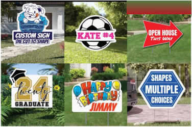SHAPED OUTDOOR COROPLAST LAWN SIGNS OR OUR PVC SIGNS Custom-shaped signs make an unforgettable first impression. Imagine a lawn sign crafted in the shape of a golf ball to promote a tournament, or a real estate sign designed like a house to showcase an open house. Instantly, the unique silhouette captures attention and communicates your message before a single word is read. In just seconds, you create curiosity, recognition, and engagement — and that kind of impact is truly priceless.