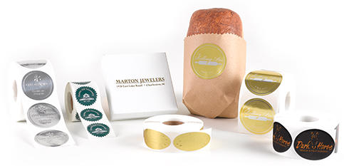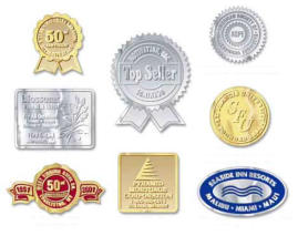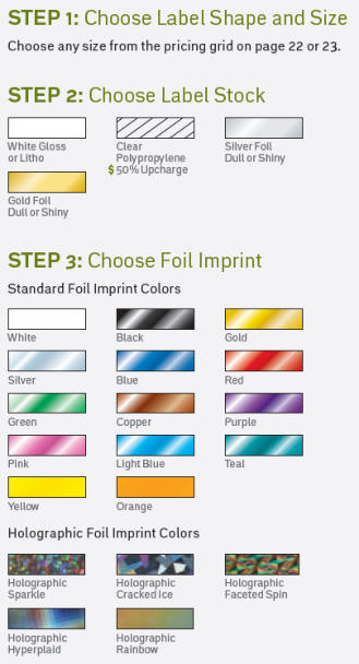 Elegant labels. White, yellow and orange foils have a matte finish. Great use when you want an opaque imprint on a Clear Polypropylene label. You can even add embossing or have them blind embossed. You can combine print and coil. Imagine a luxury look by choose a dull gold label with shinny gold foil. It trully is a brilliant look.