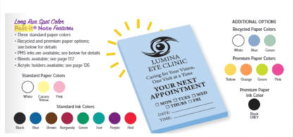 • 60 lb uncoated paper • 1 side printing in full colour • Padded on short edge • 14 pt. card back • Custom size and sheets extra Print time: 4-5 business days 2-3 day rush available - ask CDNS